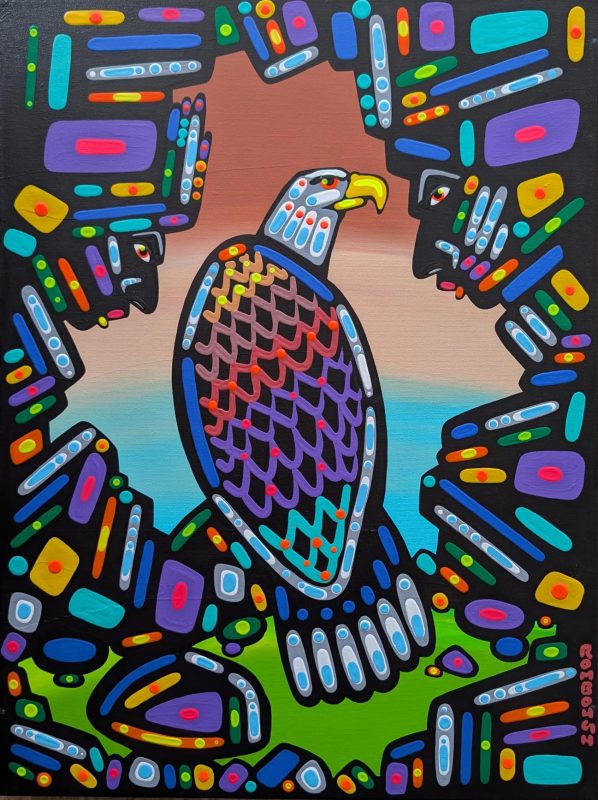 JOHN ROMBOUGH – Eagles watch, buffalo run and horses rear on canvas by John Rombough. “I’m always interested in the creative process, expressing my use of colors on canvas. I always think about the spirit within, and all the animals we share the land with. On the land I’m more at ease, taking in all the beauty. I feel a part of my Dene Ancestor’s land.”