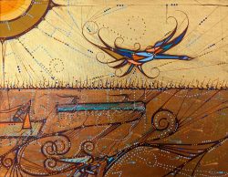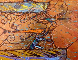Laird Goulet's unique and vibrant painting style reflects the spiritual and artistic imprints that have been inherently transferred to him by his Kokums (Grandmothers). Laird uses the power dot to best capture the floral beadwork patterns and rich birch bark biting imprints that his Kokums had mastered before him.