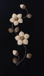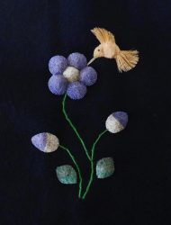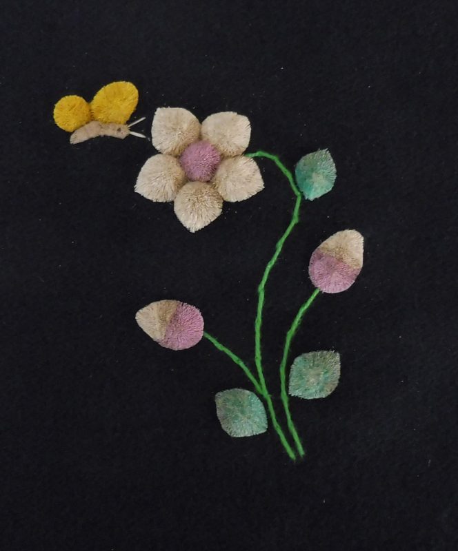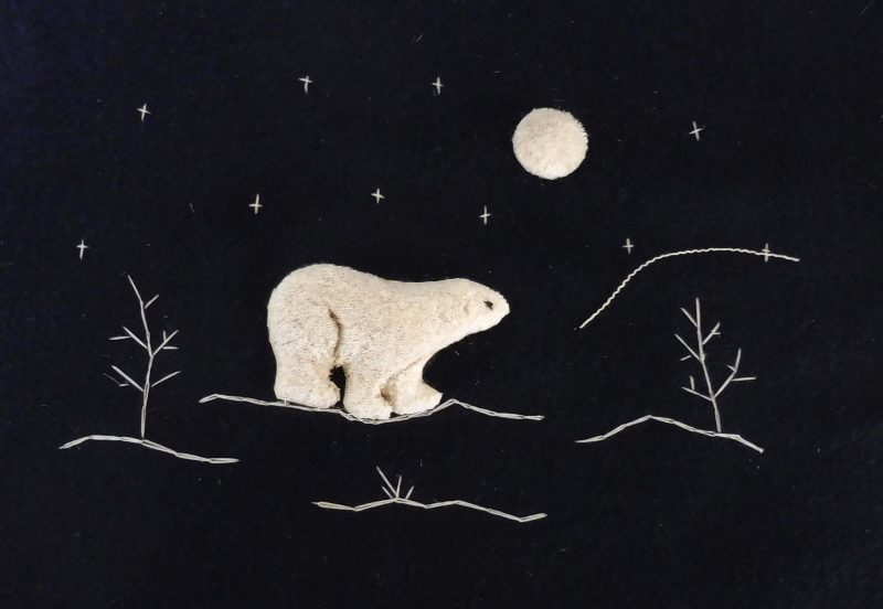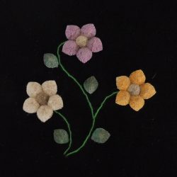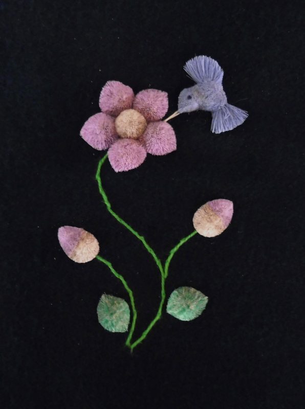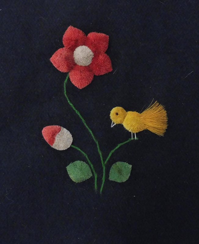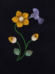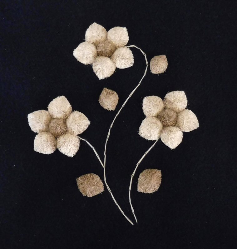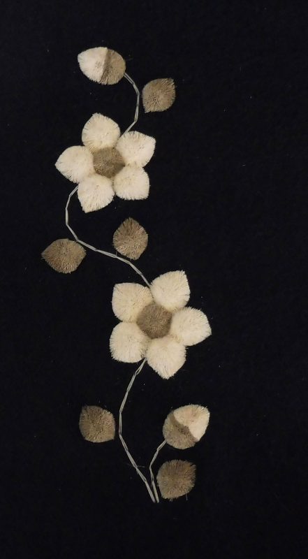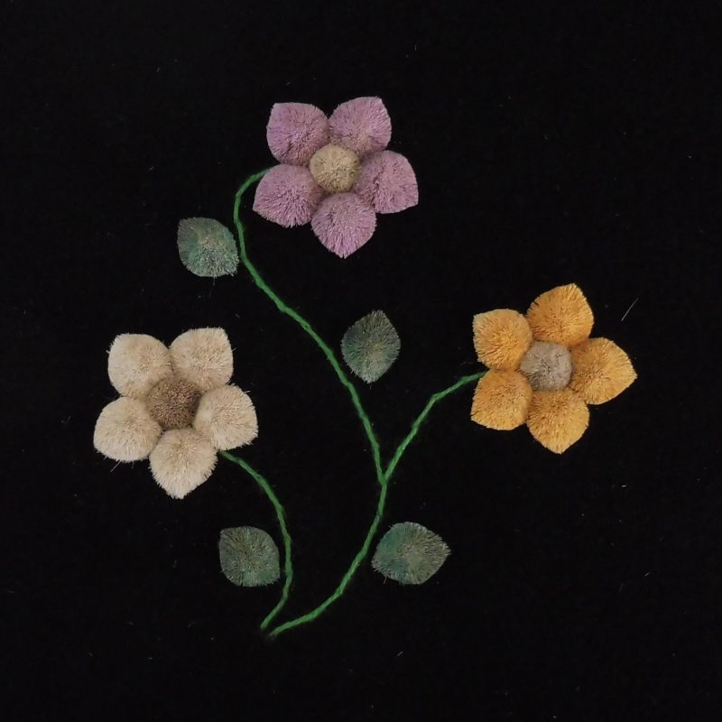 The moose hair most suitable for tufting comes from the winter fur obtained between December and March. It is usually 6 – 8 inches in length and comes from the center of the back of the animal. It is picked from the pelt by hand, sorted, washed and dyed. Only the white hair can be used for dying. Natural dyes such as berries, bark and leaves are still used, but commercial powdered dyes and crepe paper are popular as well. After dying, the hair is dried and ready for sewing. The pattern for the picture is drawn with a small stick dipped in a mixture of flour and water, onto velvet backed by canvas. These outlines are drawn freehand, and no two pictures are identical, each is an original. The method used for sewing is as follows: about 15-20 hairs are held on the pattern, a stitch is made around the hair about ¼” from the end, pulled tight and knotted at the back of the material. This makes the moose hair stand up in a tuft. The long part of the hair is cut off about ¼” from the stitch, making the hair a brisk tuft. The remainder of the hair is used in the same fashion until the outline is felled in. The hair is then sculpted with scissors, giving the finished product as we know it.
