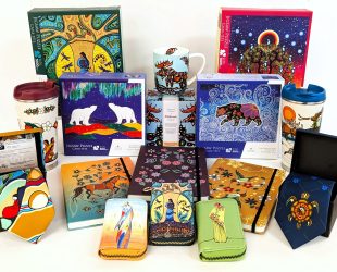 We have a large selection of original soapstone carvings, moccasins, moose hair tuftings, beaded jewelry, and wonderful items for gifting such as mugs, scarves, wallets, journals, puzzles, cards, prints, reusable bags and ceramics.